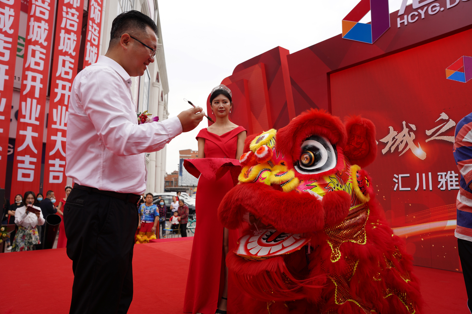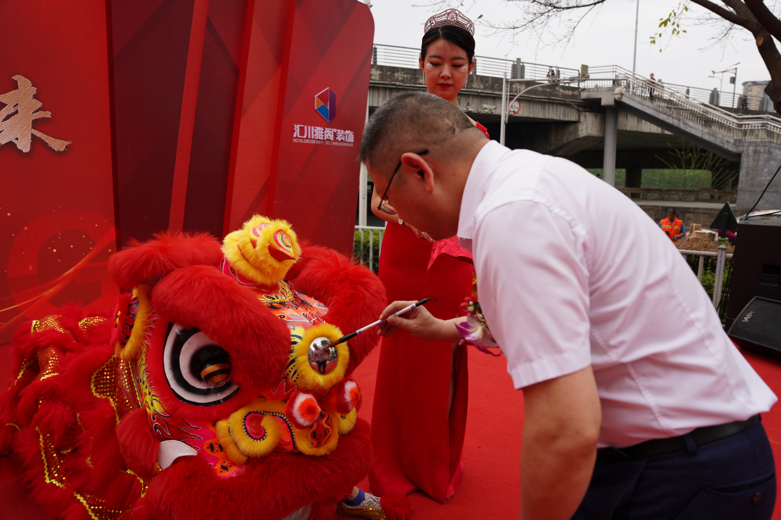由四川東辰集團董事長趙賢政先生與匯川雅閣董事長張洪明先生登臺醒獅,手持朱砂筆為祥獅點睛。
