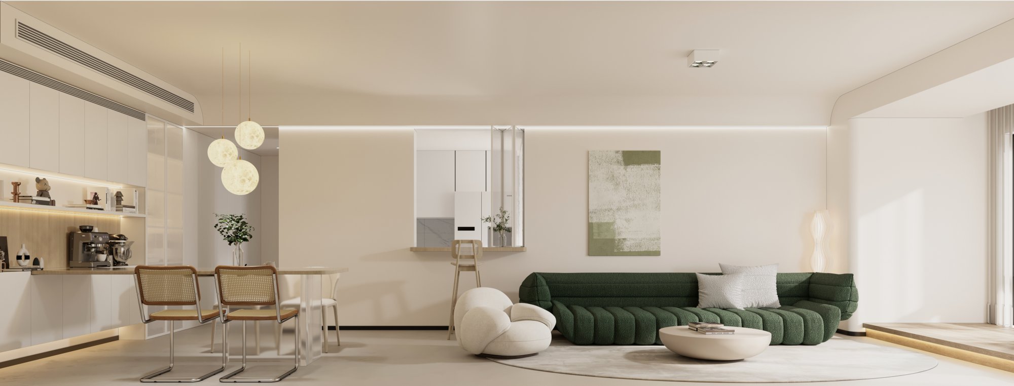 色系搭配:全屋主色調(diào)為白色,用綠色的沙發(fā)與裝飾畫(huà)進(jìn)行點(diǎn)綴。